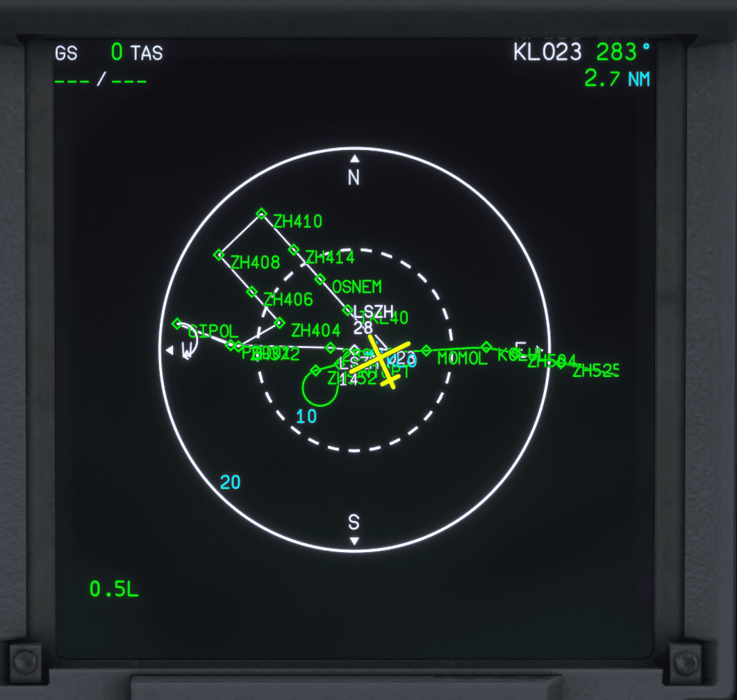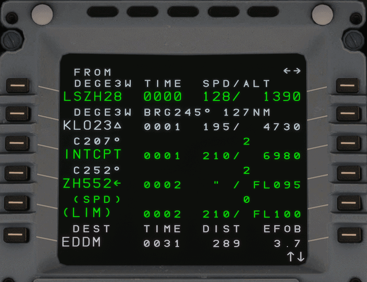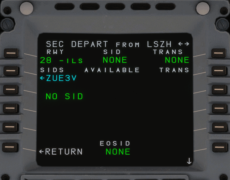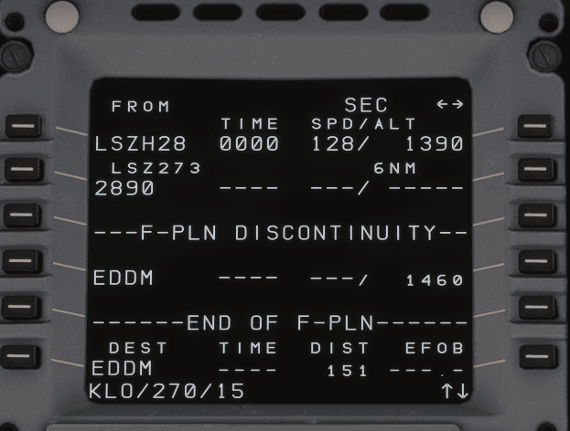 In real life, one of the most common use cases for the secondary flight plan is programming an alternative departure procedure in case of an engine failure at takeoff. For this guide, we assume that the FMS has been set up for a flight from Zurich (LSZH) to Munich (EDDM). In the primary flight plan, we have planned a departure from runway 28 following the DEGES 3W SID.