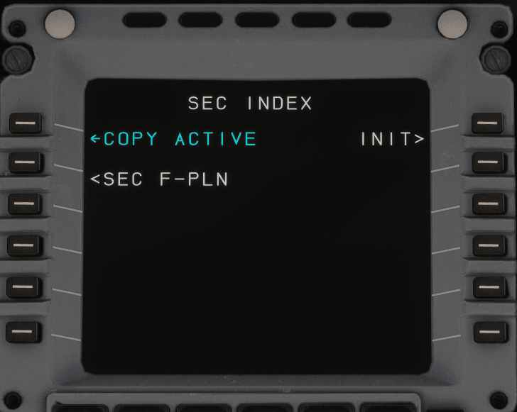 We now wish to activate the secondary flight plan to guide us safely clear of terrain and into the holding pattern at GIPOL while we troubleshoot the issue. Thanks to our preparation, all we have to do is go to the SEC F-PLN page and select ACTIVATE SEC.