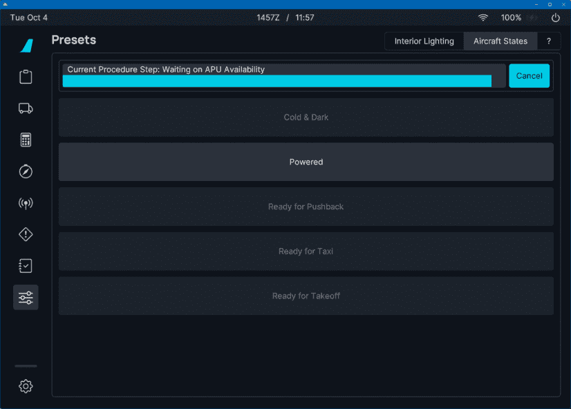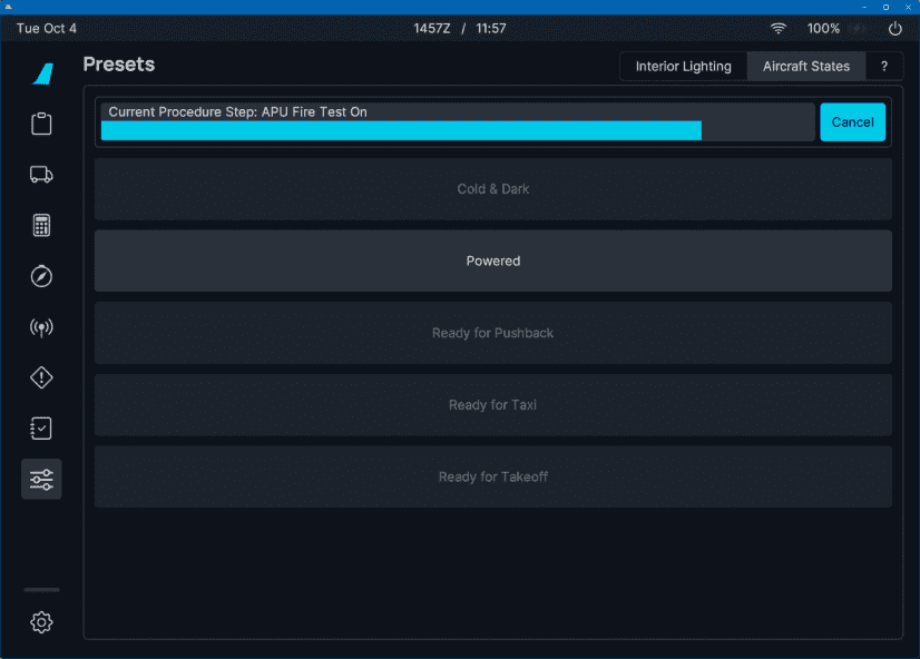 When loading a preset, the virtual co-pilot will perform all necessary setup tasks in real time. Therefore, systems like ADIR alignment, APU start, Engine starts will take the usual time to start up.
