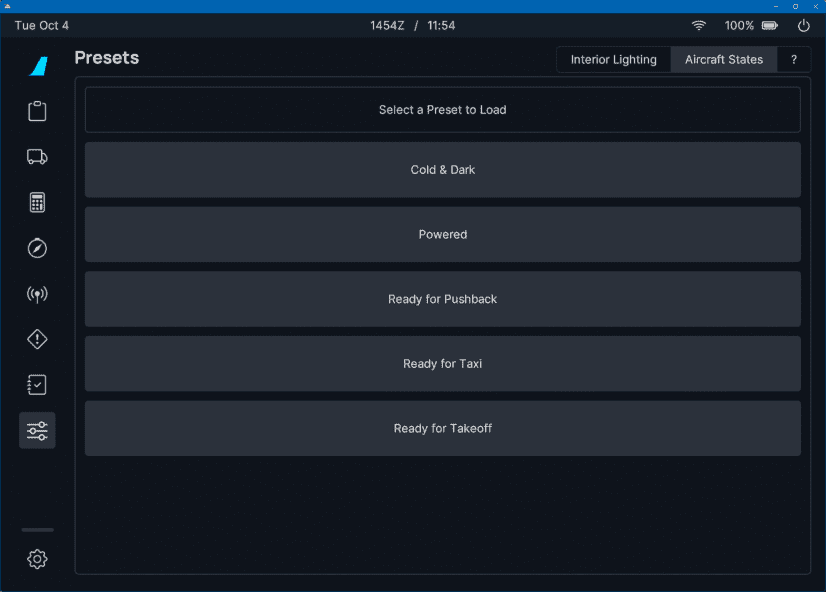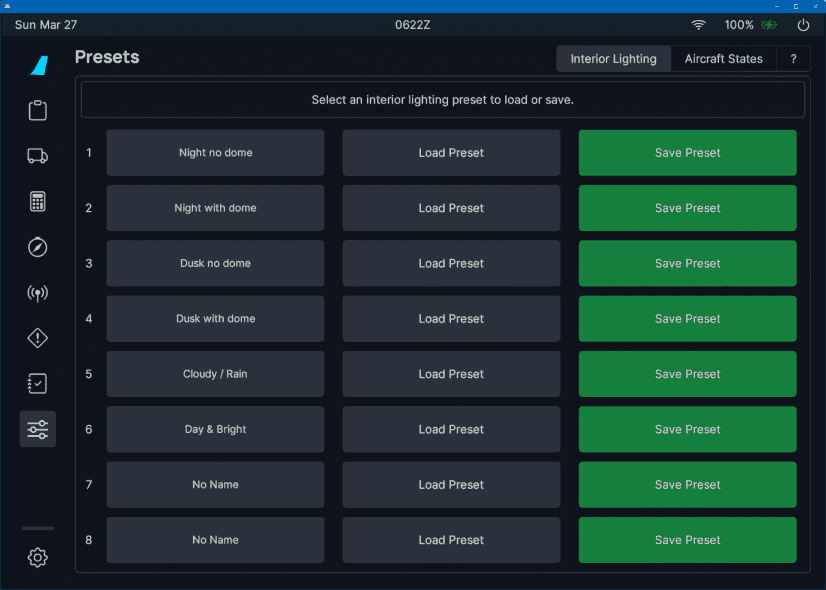 To save a preset, please click on the "Save Preset" button. The aircraft must be powered for the buttons to be enabled.