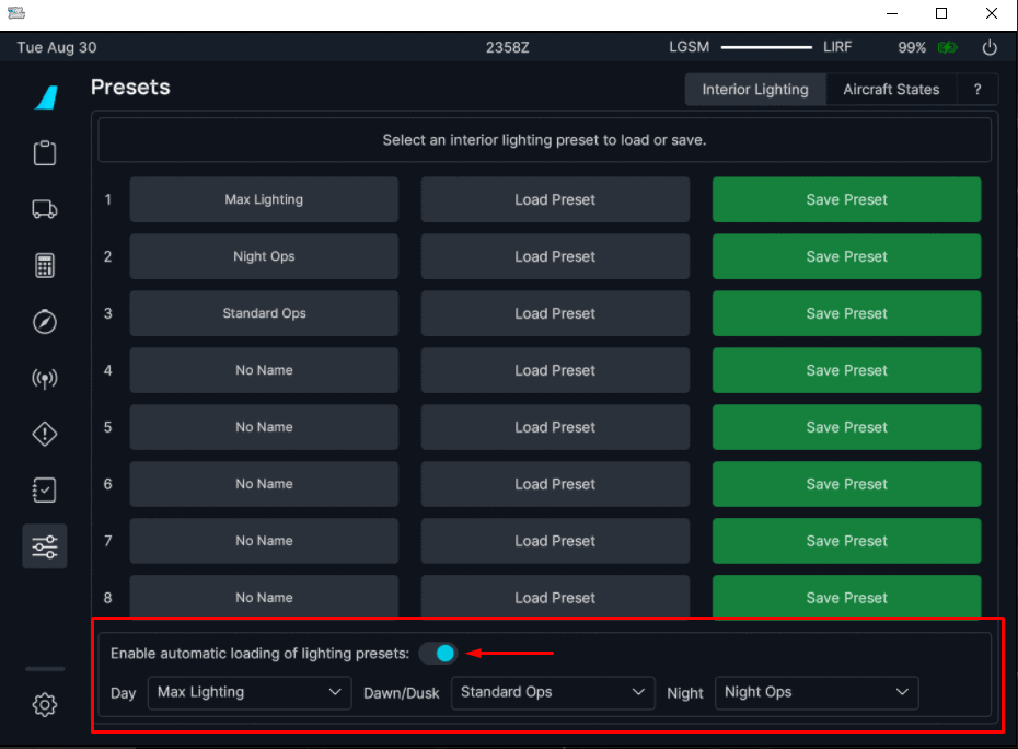 You can also configure the aircraft to set your lighting preset automatically depending on the time of day. There are three configurable settings based on the simulator's time of day.