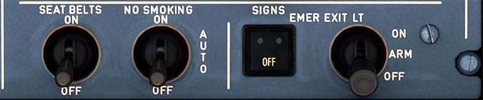 - NO SMOKING and EXIT signs come on when landing gear is extended and go off when landing gear is retracted. Low tone chime sounds when the lights go on or off.