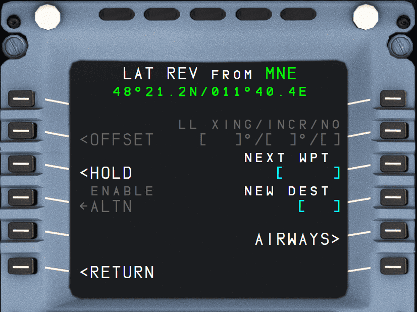 The crew calls up this page, by pressing the AIRWAYS key (5R) on the LAT REV page.