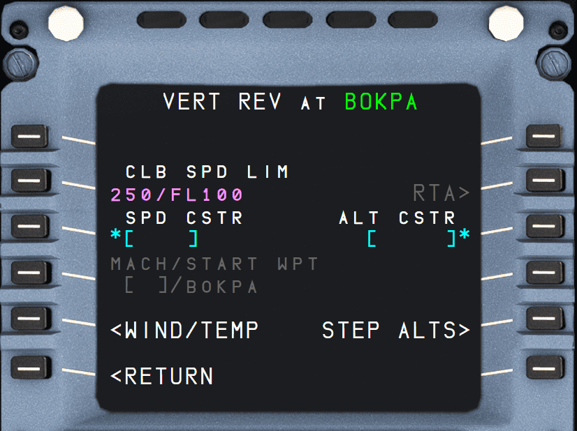 SPD and ALT CSTR may either be entered on the VERT REV page or directly on the F-PLN A page, whereas TIME CSTR may only be entered from the RTA page.