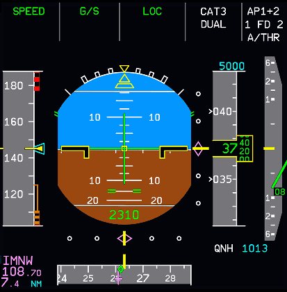 This is a green vertical bar displayed underneath the 0-degree line. It is displayed on the ground or below 30 feet radio altitude and if there is a localizer signal available. It shows the flight director yaw orders, to keep the aircraft on the runway center line.
